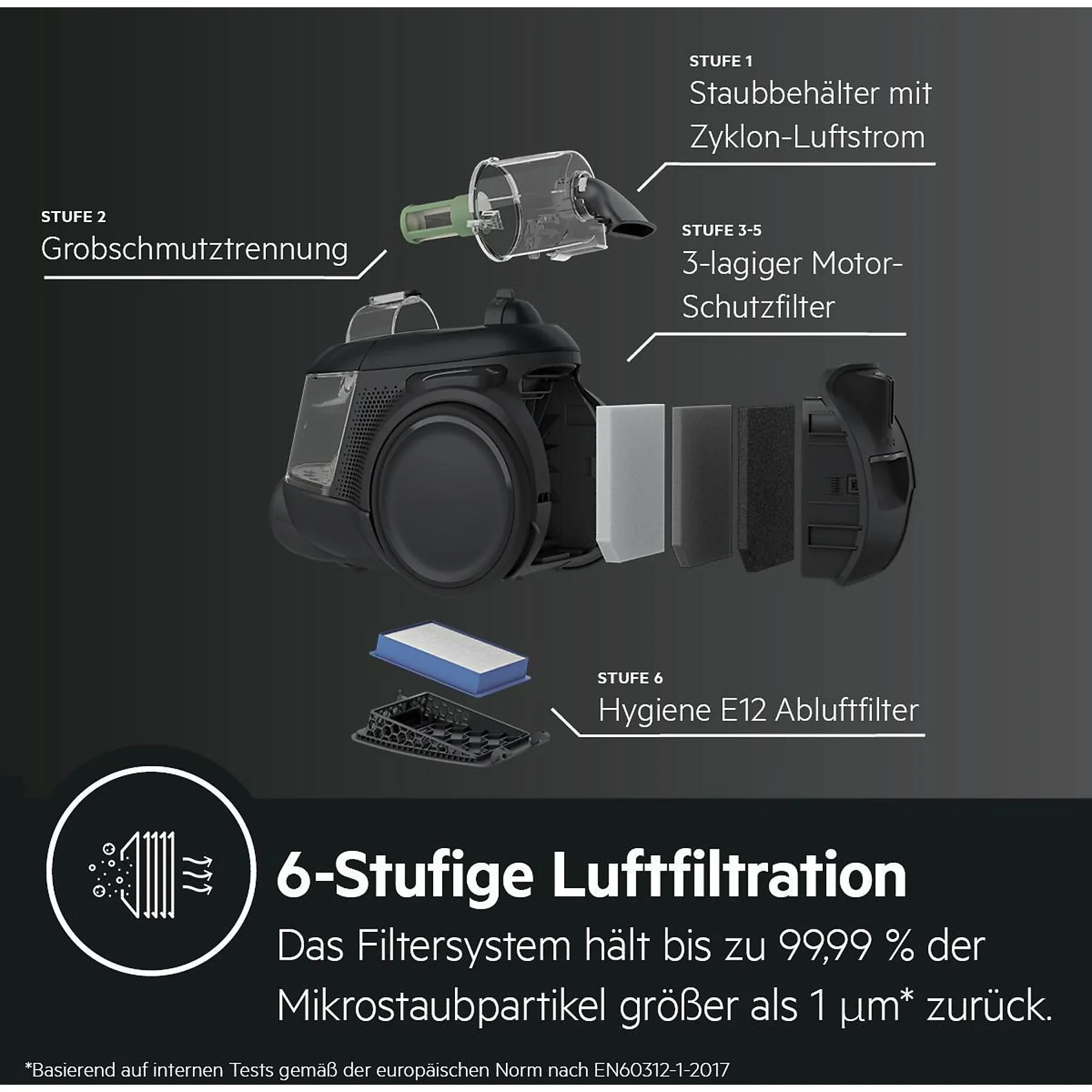 | Filtersystem | 6-stufige Filtration, Hygiene-Filter, waschbar |