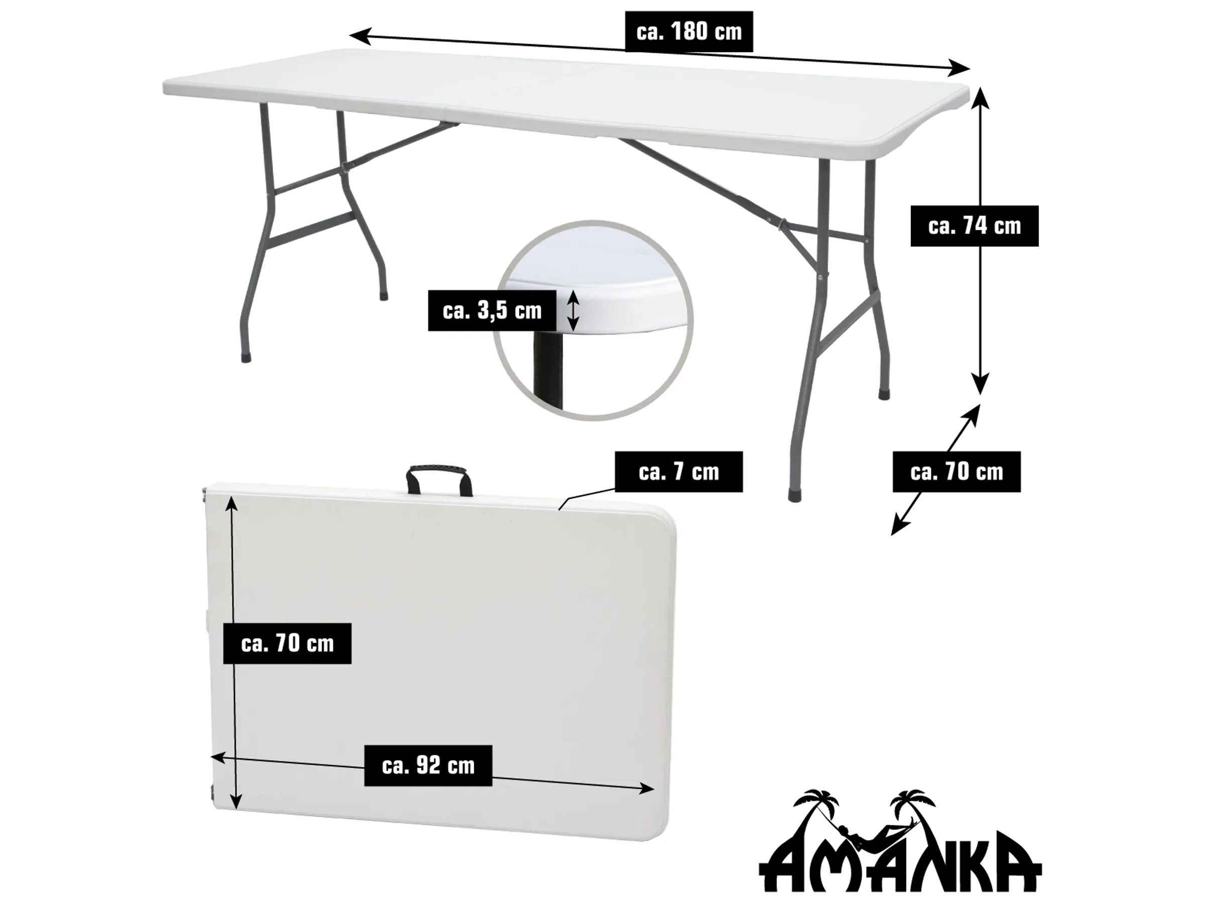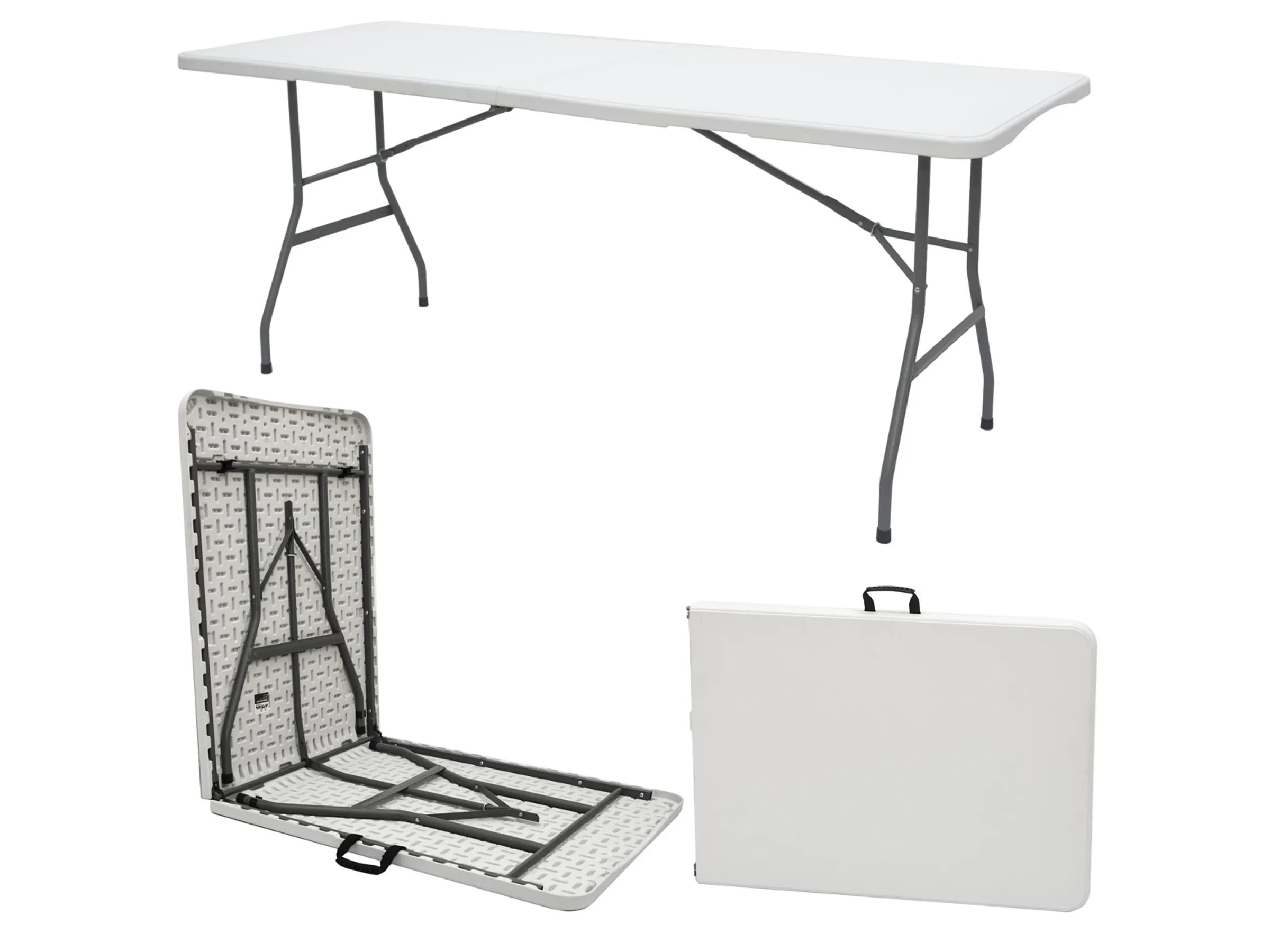 Das Metallgestell aus pulverbeschichtetem Stahl ist stabil und korrosionsbeständig. Dank Bodenschonern und Anti-Rutsch-Füßen steht die Garnitur sicher, ohne Kratzer auf empfindlichen Böden zu hinterlassen. Alle Elemente sind klappbar und mit Tragegriffen ausgestattet – so lässt sich das Set leicht transportieren und platzsparend verstauen. Perfekt für Garten, Terrasse, Camping, Feste und Veranstaltungen.