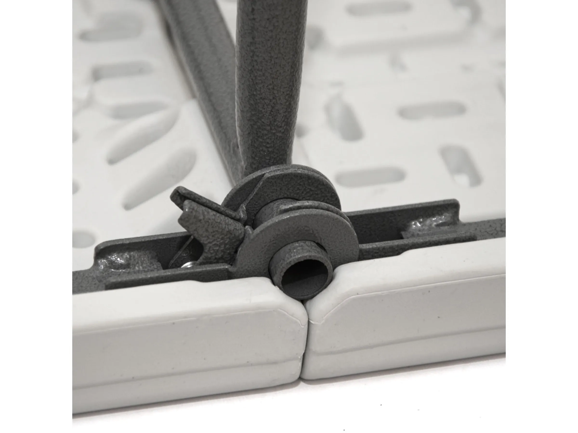 | Material | HDPE-Kunststoff (weiß) & pulverbeschichteter Stahl (grau) |
