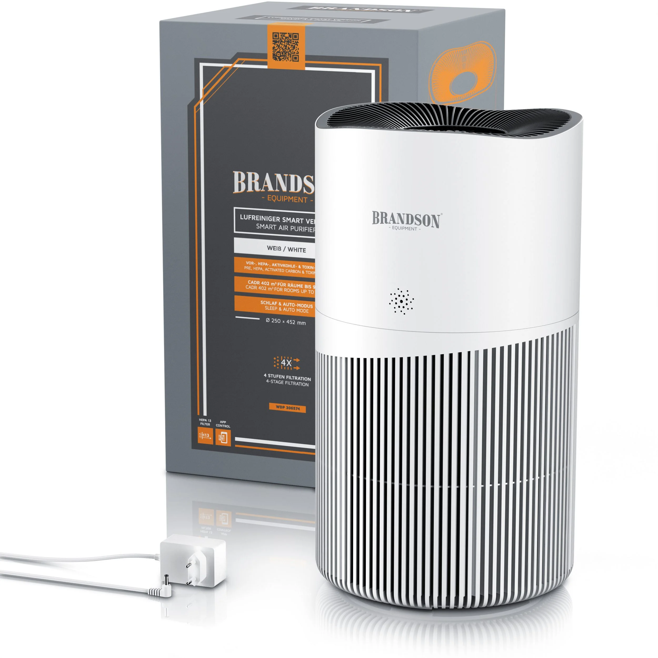 1 × Brandson Luftreiniger mit 4-Stufen-Filtersystem 1 × Vorfilter (vormontiert) 1 × HEPA 13-Filter 1 × Aktivkohlefilter 1 × Toxinfilter 1 × Netzadapter (EU) mit ca. 1,8 m Kabel 1 × Bedienungsanleitung |