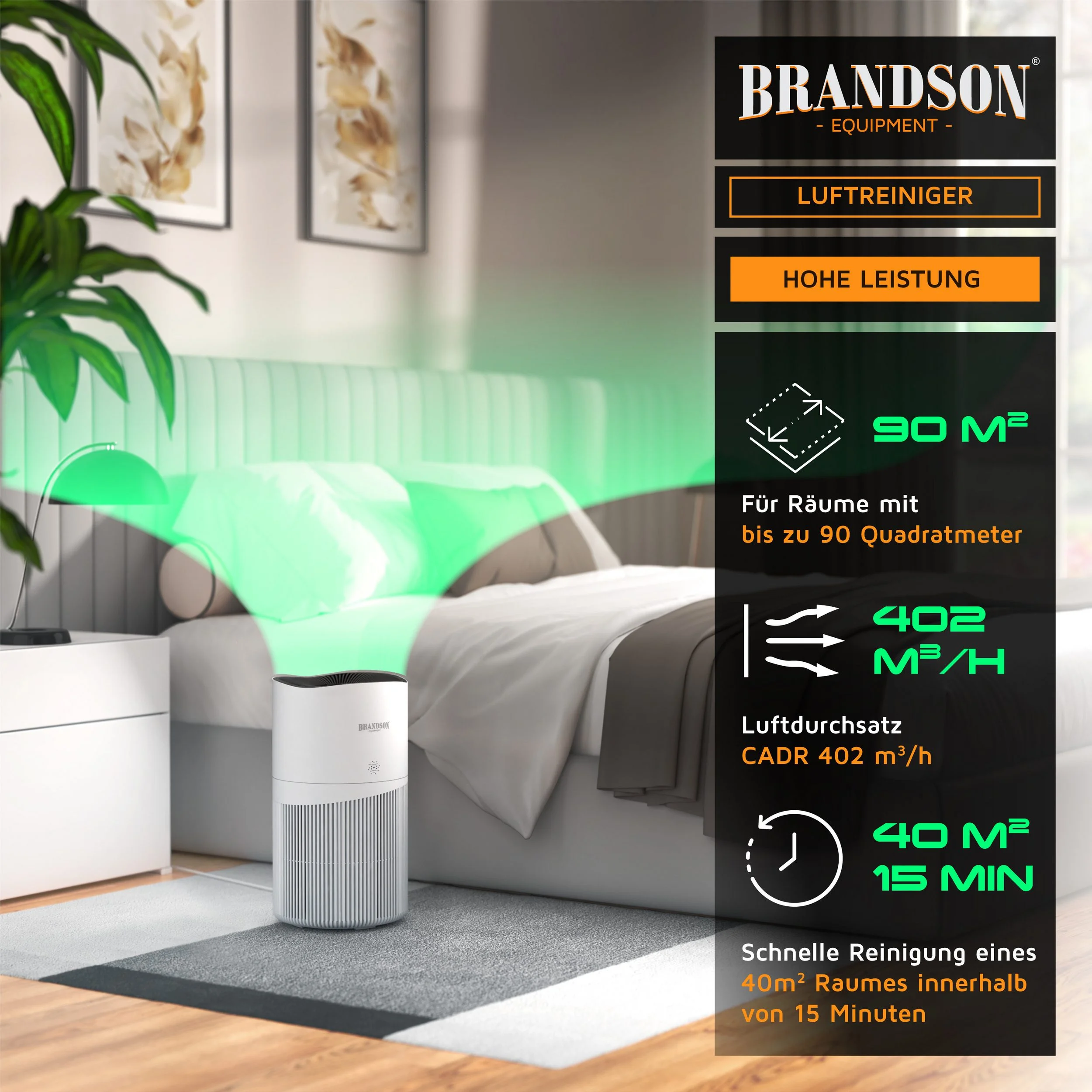 Clean Air Delivery Rate (CADR): 402 m³/h Geeignete Raumgröße: bis zu ca. 90 m² (je nach Raumhöhe) Für Wohnzimmer, Schlafzimmer, Büros und größere Wohnbereiche geeignet |