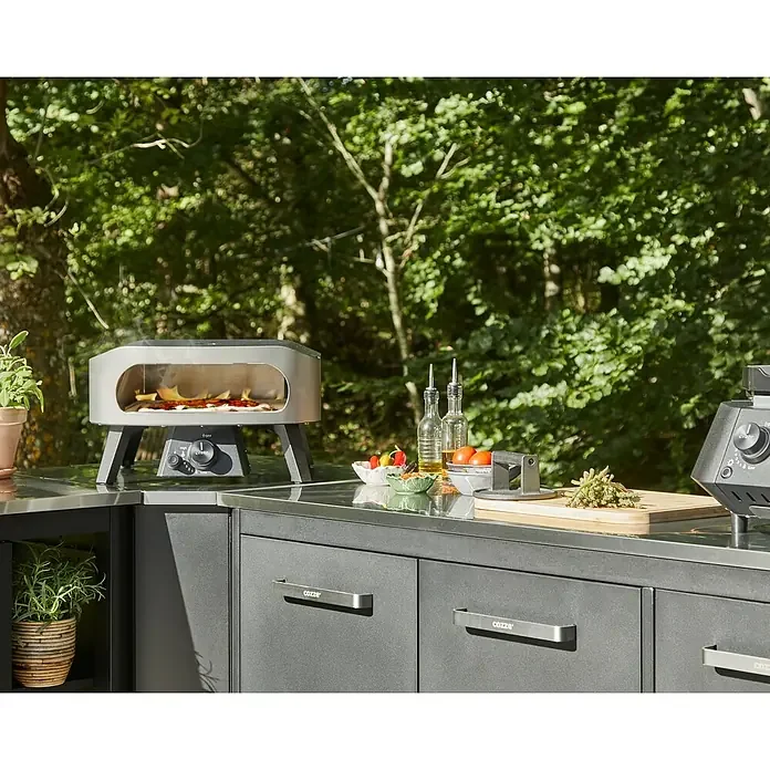 Mit dem Cozze Pizzaofen Classic 13 bereiten Sie Pizza und Flammkuchen zuhause so, wie man sie aus der Pizzeria kennt. Die Grillfläche von 34 × 34 cm bietet Platz für Pizzen bis ca. Ø 34 cm, während der leistungsstarke Gasbrenner mit bis zu 6 kW den Ofen in kurzer Zeit auf Betriebstemperatur bringt. Die große Frontöffnung von etwa 8 × 36 cm erleichtert das Einschieben und Drehen der Pizza und sorgt für ein komfortables Handling.