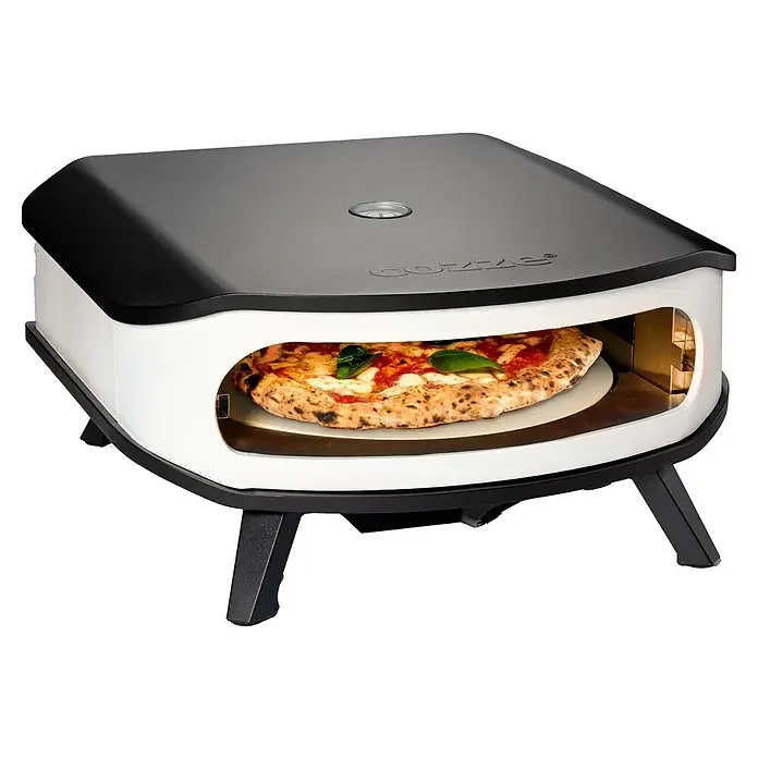 Highlights: Pizzaofen für Ergebnisse wie beim Italiener, rotierender Cordierit-Pizzastein für gleichmäßige Bräunung, Maximaltemperaturen bis 450 °C, große Frontöffnung für komfortables Handling, stufenlose Temperaturregelung über Drehregler und kompakte Bauweise für flexible Nutzung im Außenbereich.