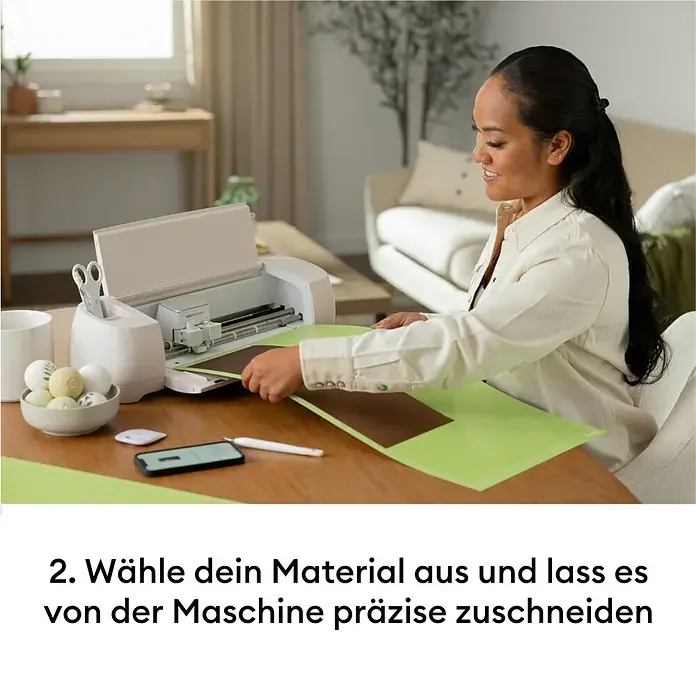 Über 100 verschiedene Materialien – von Vinyl über Iron-On bis hin zu Karton, Fotokarton, Kork oder verstärktem Stoff bis ca. 2 mm Stärke – können verarbeitet werden. Die Kompatibilität mit Smart Materials™ ermöglicht lange Schnitte bis 3,6 m Länge ganz ohne Schneidematte. Alternativ kann die beiliegende LightGrip-Matte für reguläre Formate genutzt werden. Mit der Cricut Design Space® App (für PC, Smartphone oder Tablet) stehen unzählige Motive, Schriftarten und Gestaltungsmöglichkeiten zur Verfügung. Eigene Designs lassen sich ebenfalls ganz einfach importieren, bearbeiten und ausschneiden, auch Ausdrucke von Tintenstrahldruckern können als Print-Then-Cut verarbeitet werden.