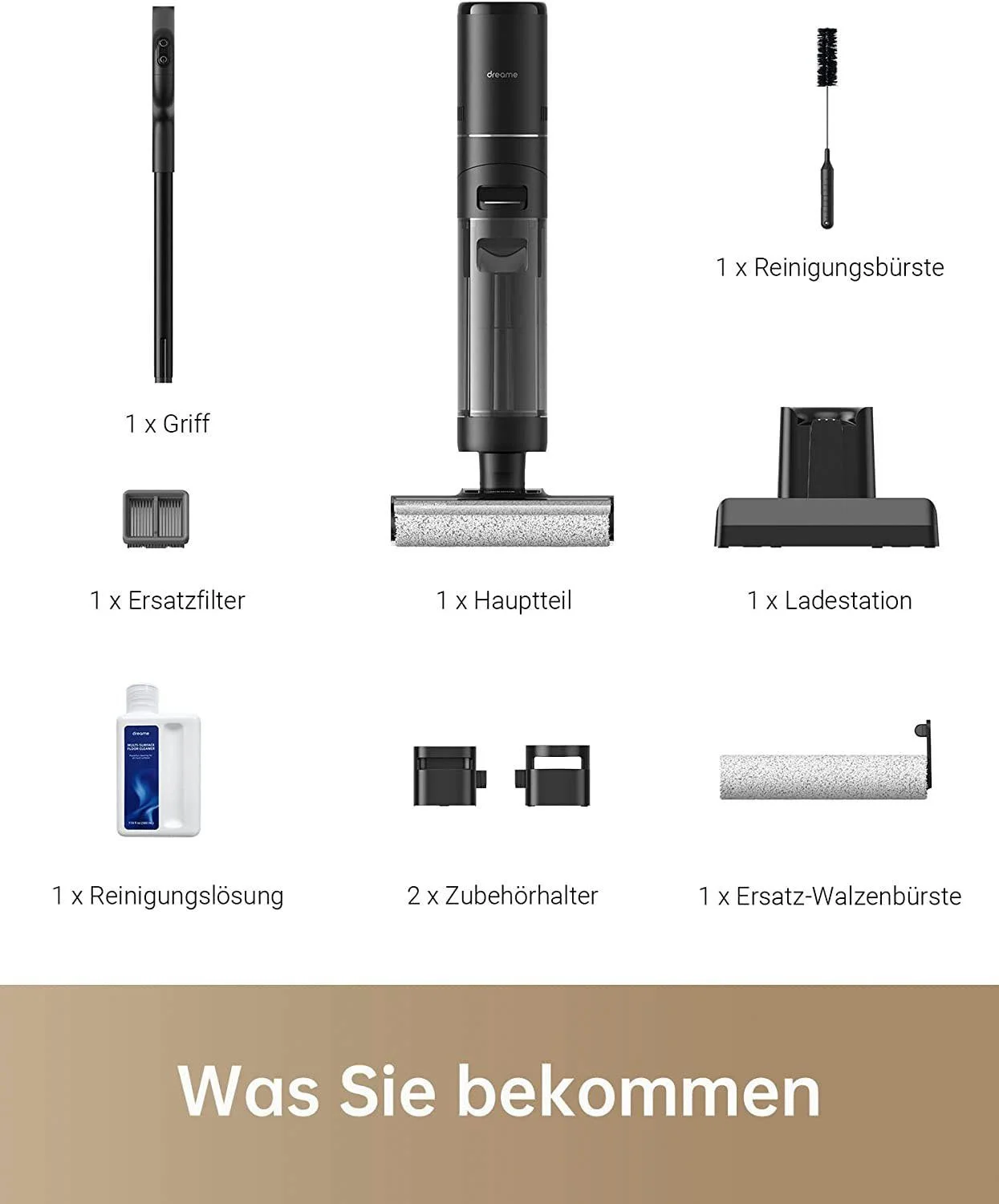 1 × Dreame H12 Pro Nass-Trockensauger 1 × Ladestation mit integrierter Selbstreinigungs- und Trocknungsfunktion 1 × Ersatzwalzenbürste 1 × Ersatzfilter (HEPA) 1 × Reinigungsbürste 1 × Aufbewahrungsbox für Zubehör 1 × Bedienungsanleitung |