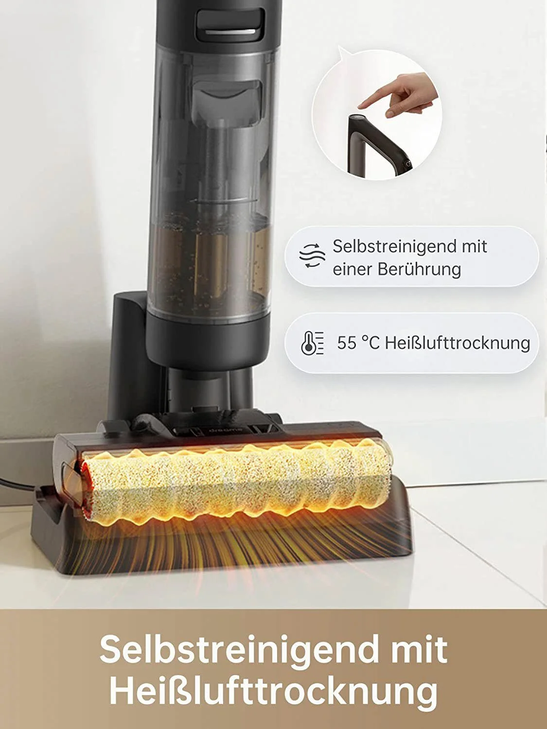 300 W Motor • Kantenlose Bürstenwalze • Bis zu 30 Min Laufzeit • Selbstreinigung & Heißlufttrocknung • LED-Touch-Display