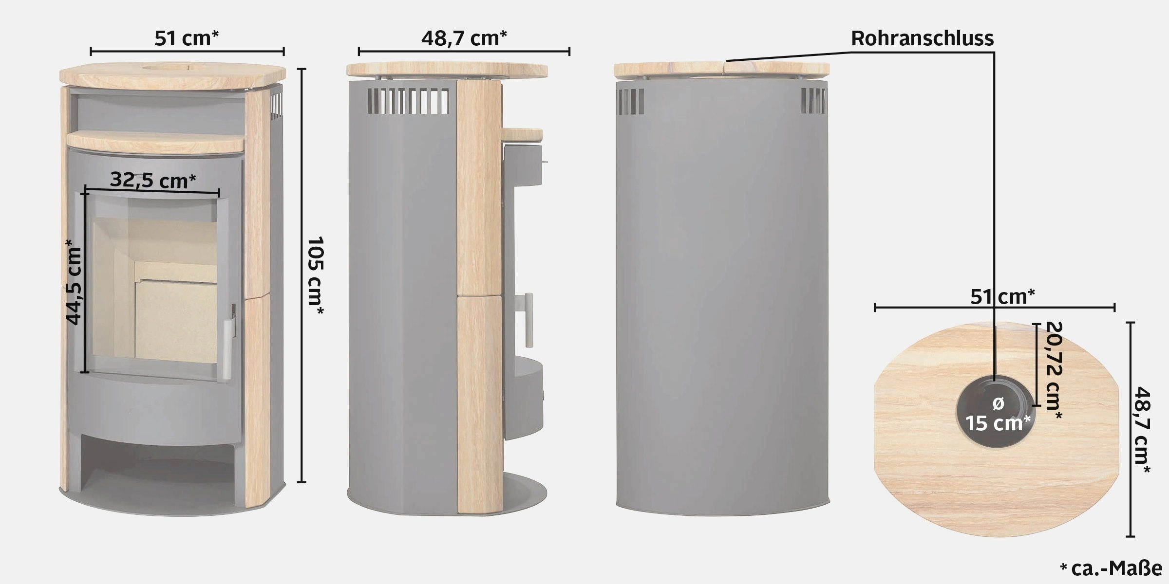 | Nicht enthalten | Rauchrohr, Bodenplatte, Dekoration |