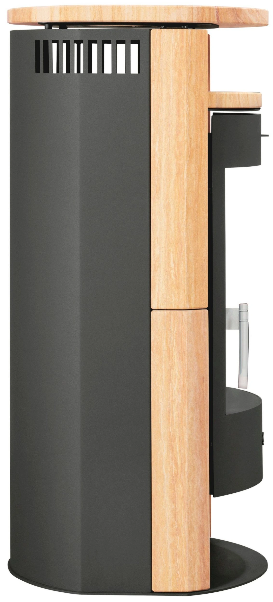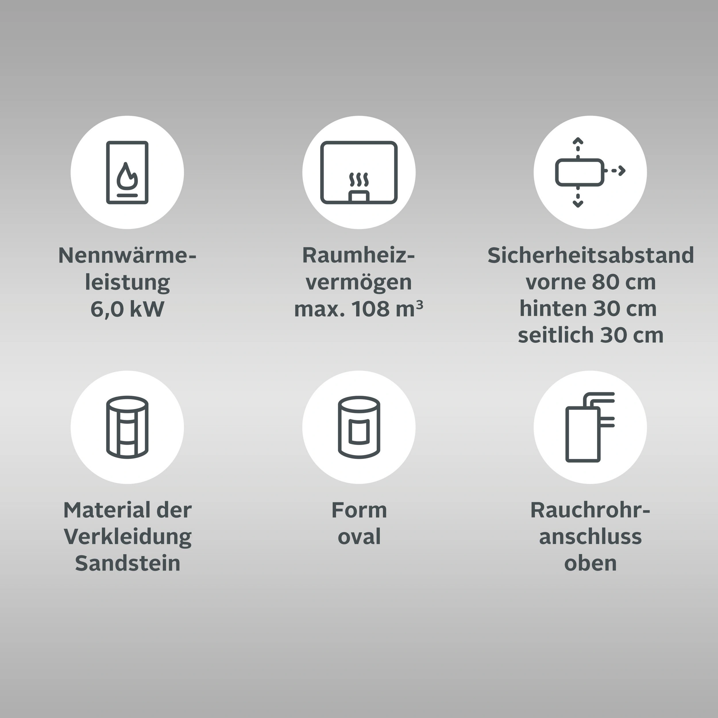 Highlights: Ovaler Stahlkorpus mit Sandstein-Akzenten, Scheibenspülung über Tertiärluftzufuhr, integriertes Holzfach und Warmhaltebereich, effiziente Wärmeabgabe für gemütliche Wohnräume.