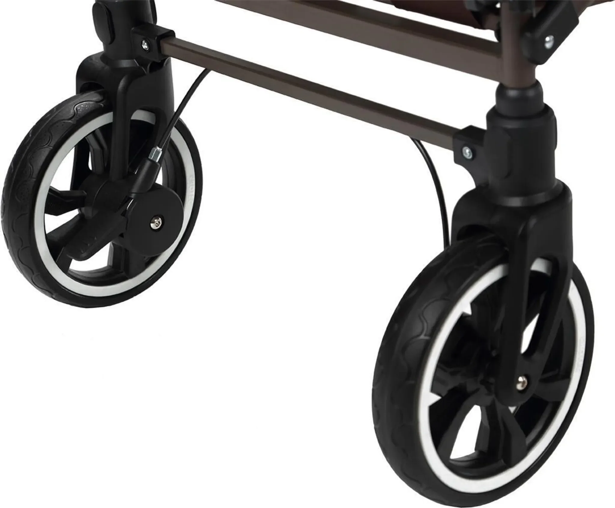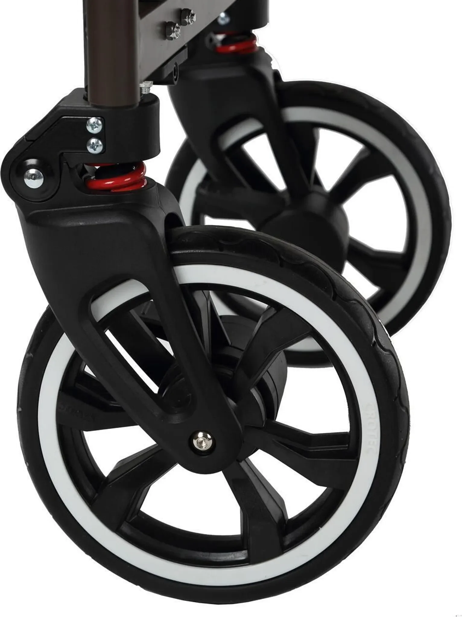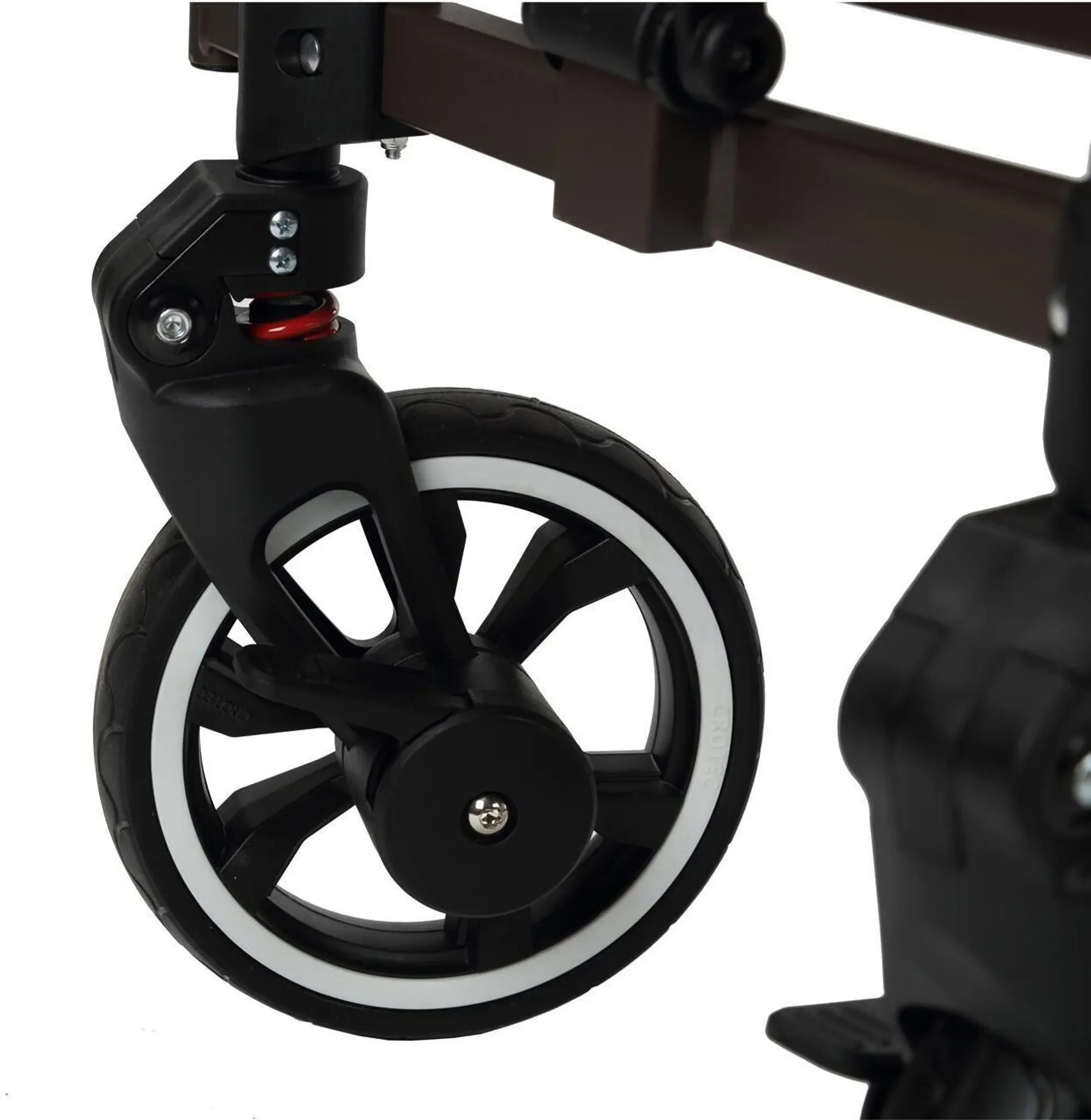 Highlights: Robuste Konstruktion, gefederte PU-Räder für stabilen Fahrkomfort, UV-geschütztes Sonnendach, integrierte Innenraumverlängerung, klappbare Hecktasche, sehr kippsicher durch tiefen Schwerpunkt.