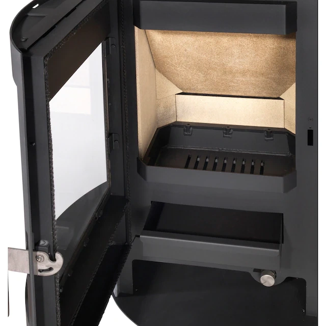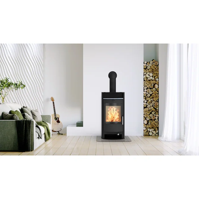 Die großflächige, gerade Sichtscheibe bietet einen freien Blick auf das Flammenspiel. Dank Sekundärluftführung wird die Scheibe durch einen Luftstrom sauber gehalten, sodass seltener nachgereinigt werden muss. Ein praktisches Holzfach sorgt für griffbereites Brennmaterial, während die Naturstein-Teefachplatte das Design hochwertig abrundet.