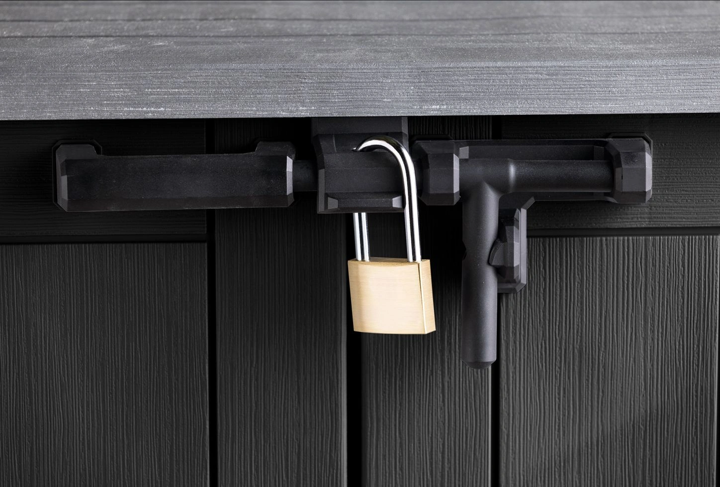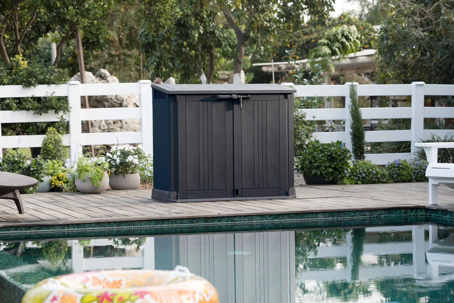 Die Keter Store It Out PRIME Aufbewahrungsbox bietet viel Stauraum für Gartengeräte, Gartenmöbel oder Grillutensilien. Alternativ können zwei Abfalltonnen bis 120 l untergebracht werden. Zwei großzügige Türen und ein aufklappbarer Deckel mit Gasdruckfedern erleichtern das Verstauen.