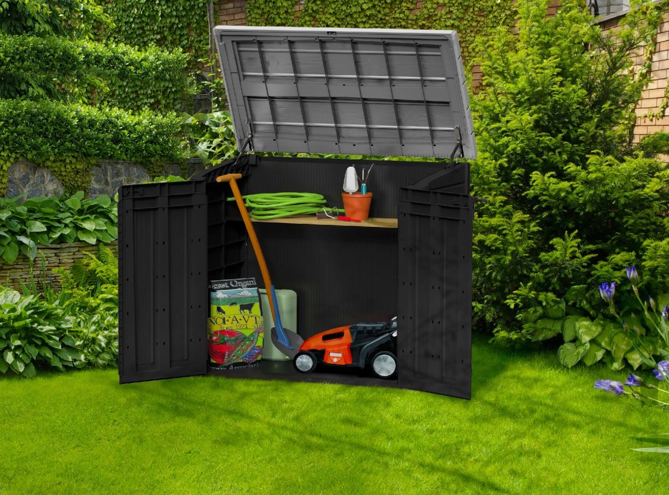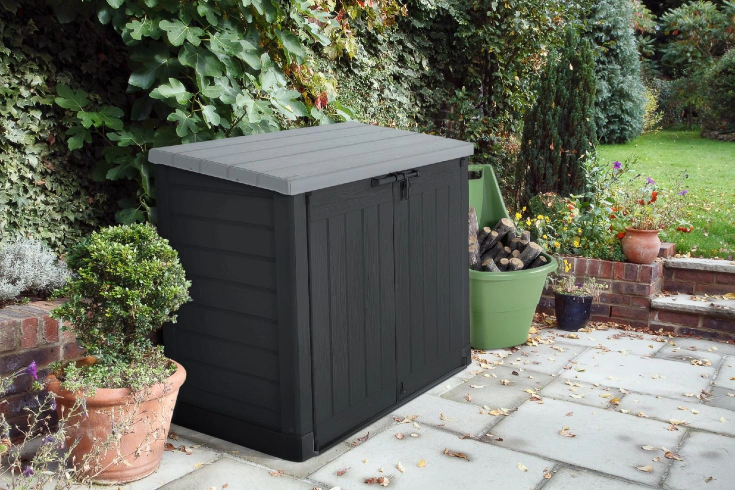 Die Keter Store It Out MAX Universalbox ist ideal zum Verstauen von Gartengeräten, Gartenmöbeln oder Grillutensilien. Alternativ bietet sie Platz für zwei Abfalltonnen bis 240 l. Zwei Türen und ein aufklappbarer Deckel mit Gasdruckfedern ermöglichen komfortables Ein- und Ausräumen.