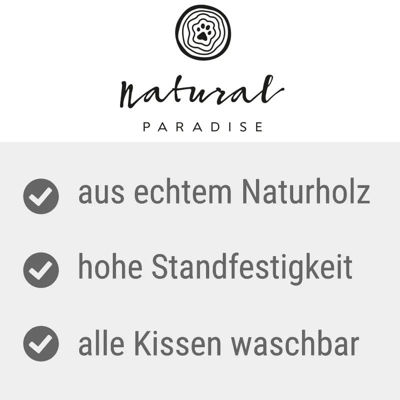 | Reinigung | Polster und Kissen abnehmbar und bis 30 °C maschinenwaschbar; Holzteile mit feuchtem Tuch abwischbar |