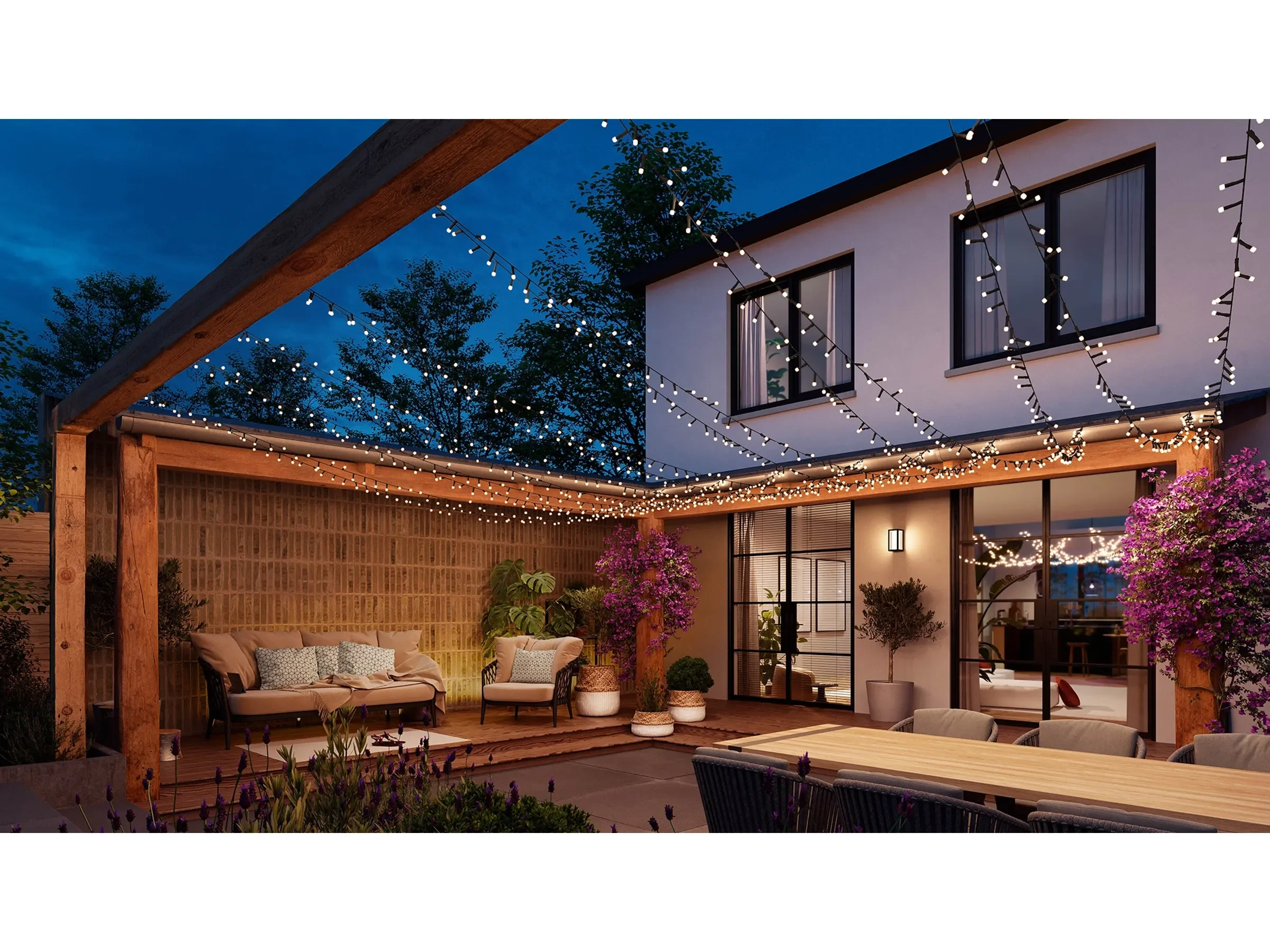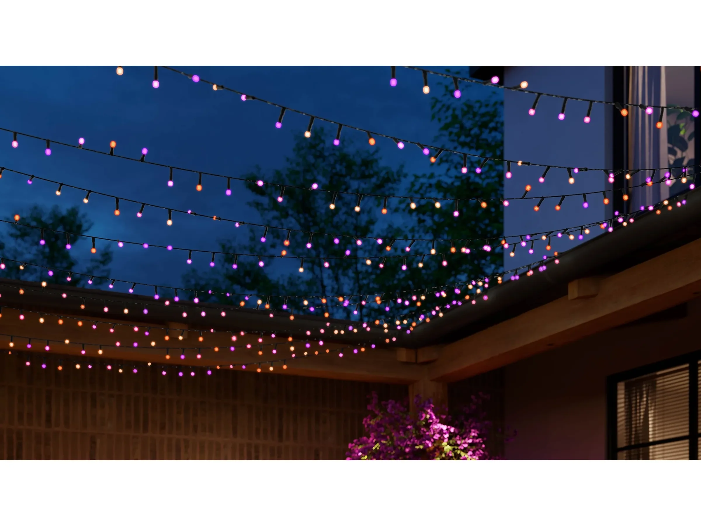 Die Philips Hue Festavia LED-Lichterkette verwandelt Bäume, Geländer und Fassaden in dynamische Lichtinstallationen. Auf 40 m Länge sitzen 500 Mini-LEDs, die 16 Millionen Farben und alle Weißtöne wiedergeben können – von warmem Kerzenschein bis zu kühlem, klaren Licht. Dank der speziellen Gradient-Funktion können mehrere Farben gleichzeitig auf einer Kette dargestellt werden, was fließende Farbverläufe und moderne Lichteffekte ermöglicht.