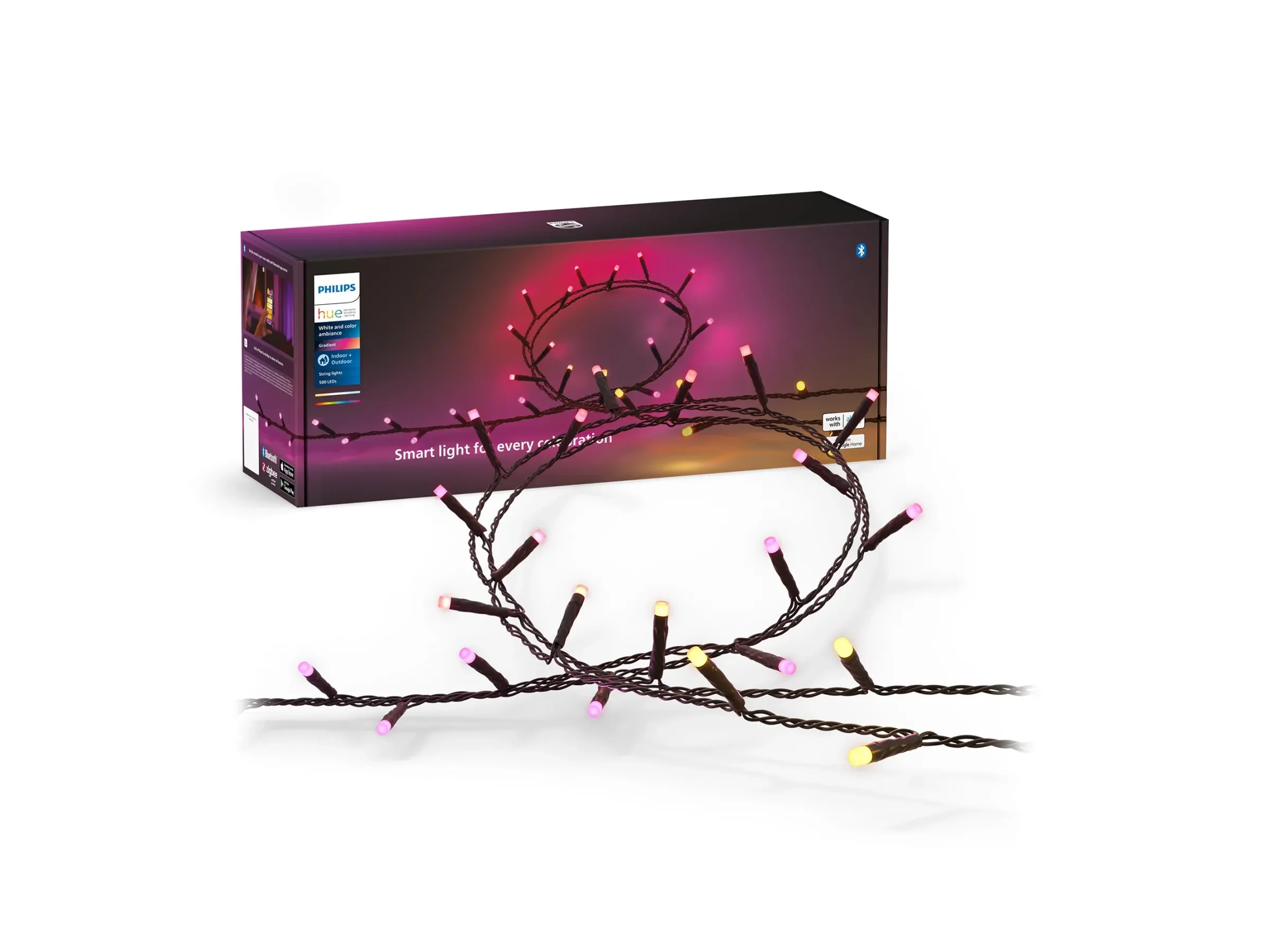 Highlights: 40 m smarte Lichterkette mit 500 LEDs, beeindruckende Gradient-Farbverläufe, nahtlose Einbindung in das Philips-Hue-Ökosystem, Lichtszenen und Effekte für Feiertage und Alltag, Musik-Synchronisation für besondere Stimmungen im Innen- und Außenbereich.