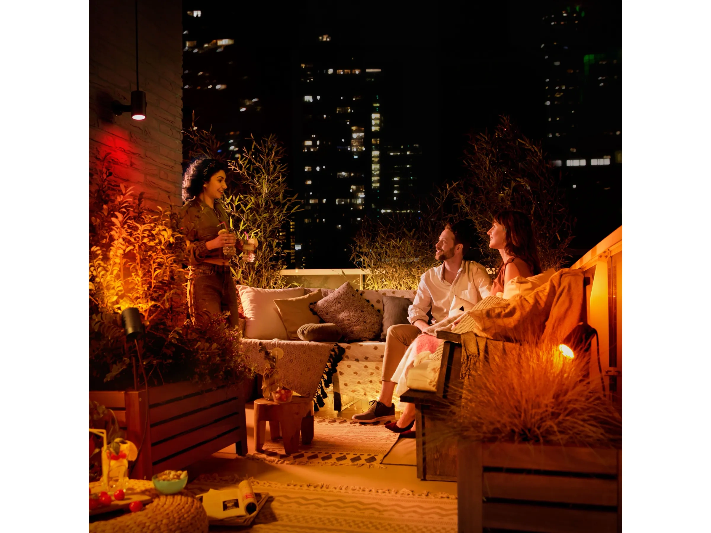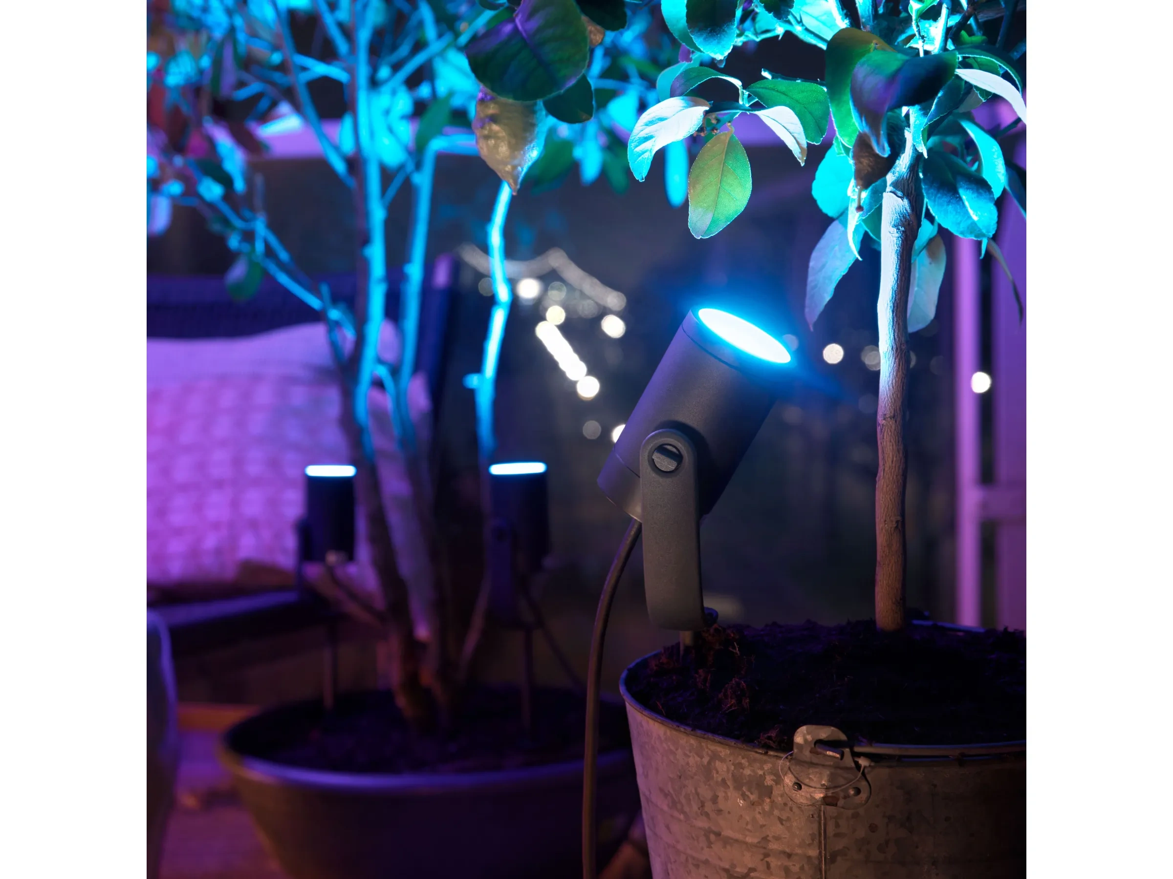 Der Philips Hue LED-Spot Lily ermöglicht die individuelle Beleuchtung von Garten und Balkon mit Millionen von Weiß- oder Farbtönen. Das Basis-Set enthält Netzteil, Stecker und ein 5 m Verlängerungskabel, sodass bis zu fünf Niedervolt-Leuchten angeschlossen werden können.
