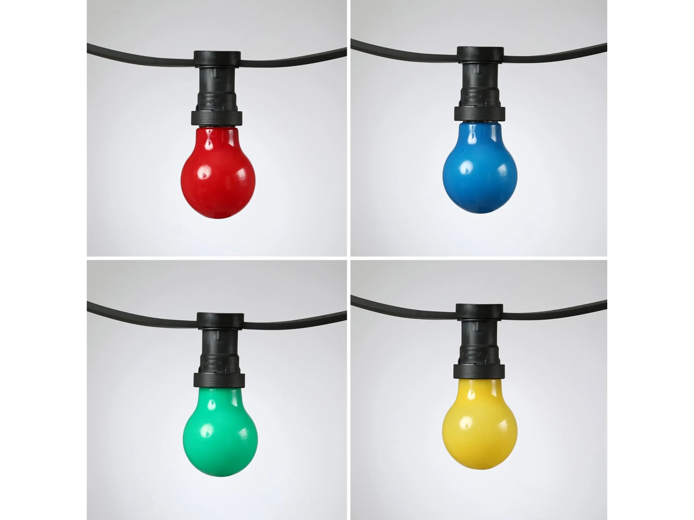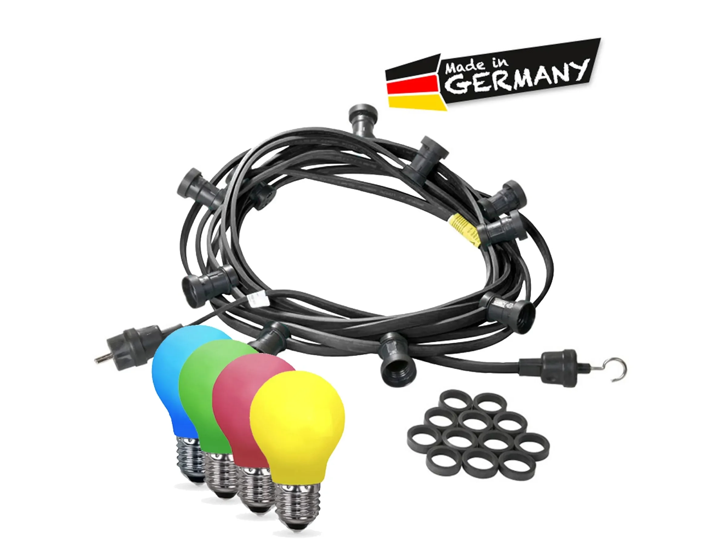 Highlights: Klassische Biergartenoptik in Schwarz, 60 farbintensive LED-Tropfenlampen, wetterfest für ganzjährigen Einsatz, langlebige bruchfeste Lampen, fertig montierte E27-Fassungen, energiesparend und besonders robust – ideal für Partys, Gartenbereiche und Outdoor-Events.