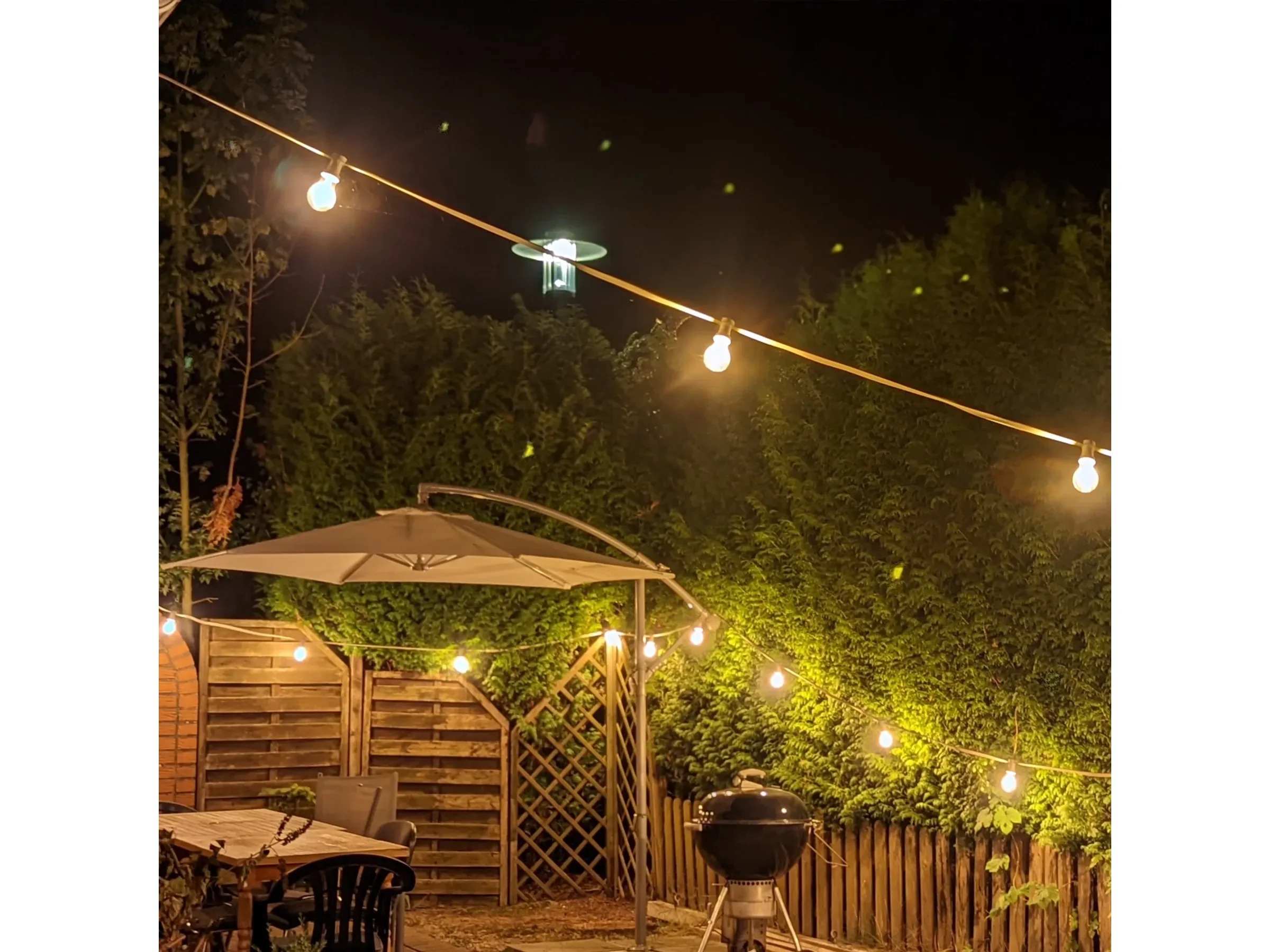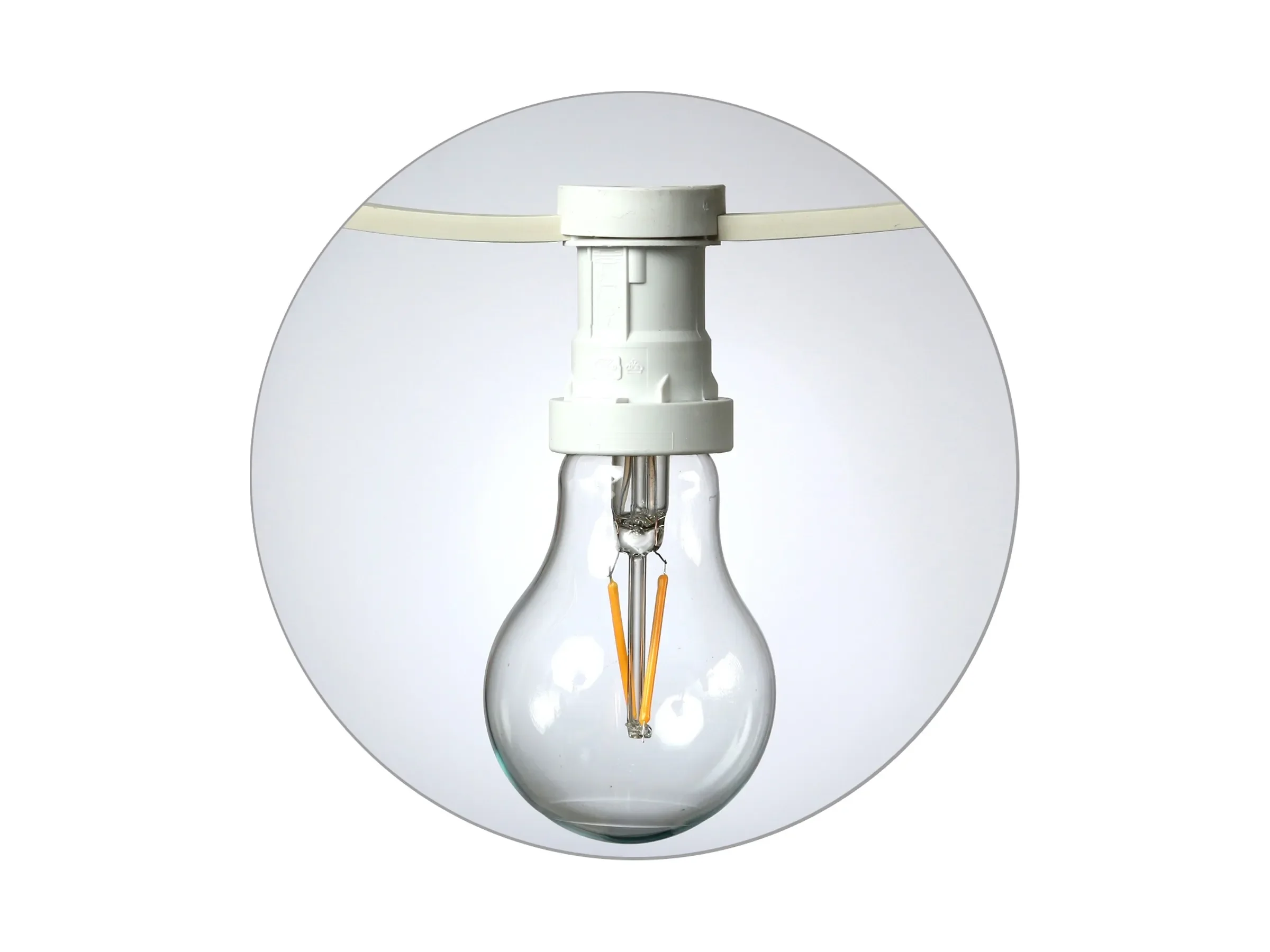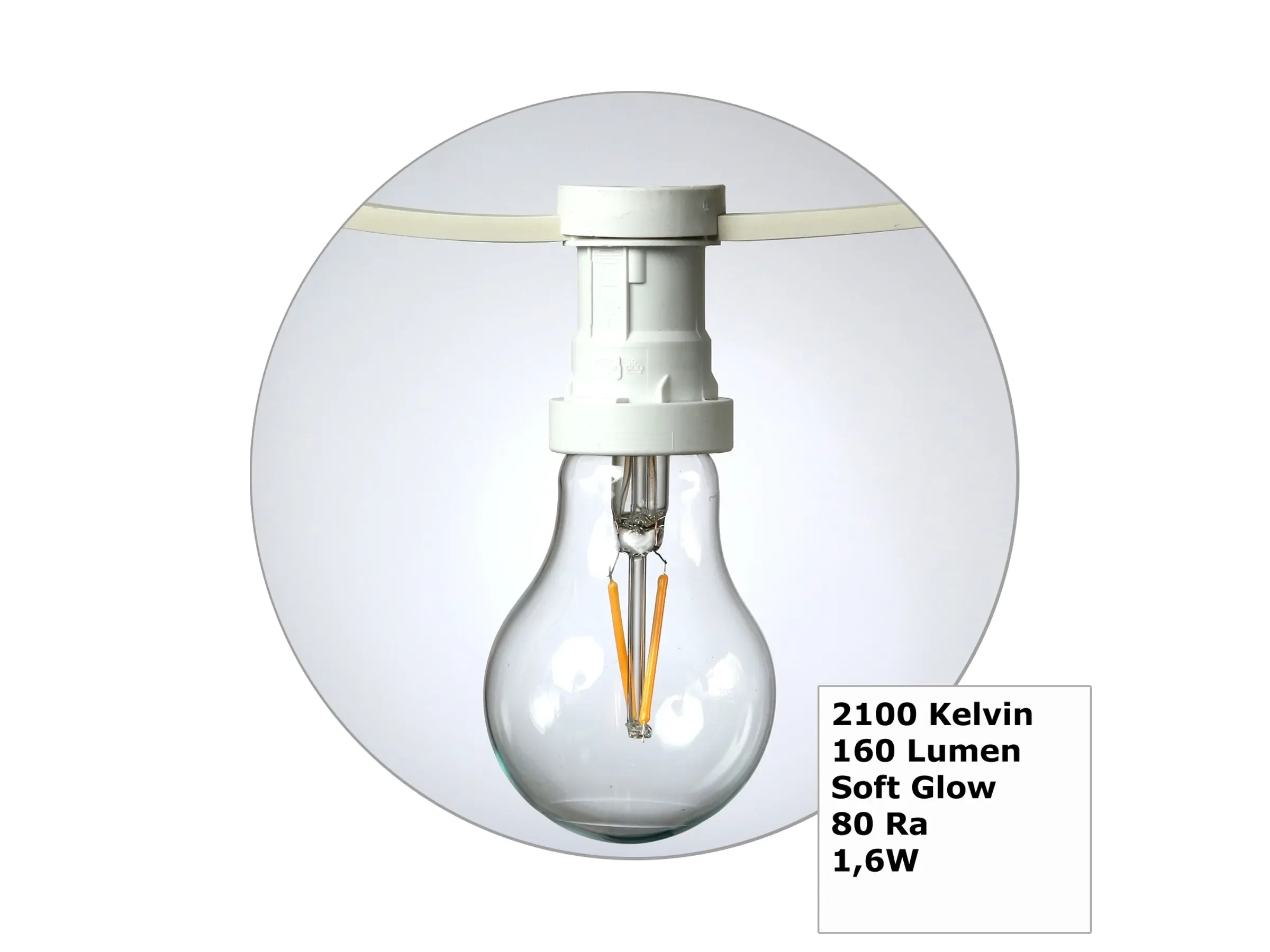 Das wetterfeste, robuste Flachbandkabel, die widerstandsfähigen Fassungen mit Gummidichtung und der Schutzstandard IP44 ermöglichen eine ganzjährige Nutzung im Außenbereich. Die energiesparenden 1,6-W-Filamentlampen erzeugen 160 Lumen pro Lampe und liefern ein warmes, einladendes Licht mit 2100 K. Die Filamentfäden im Retro-Stil verleihen jeder Umgebung einen dekorativen Akzent. Die Leuchtmittel sind nicht dimmbar.