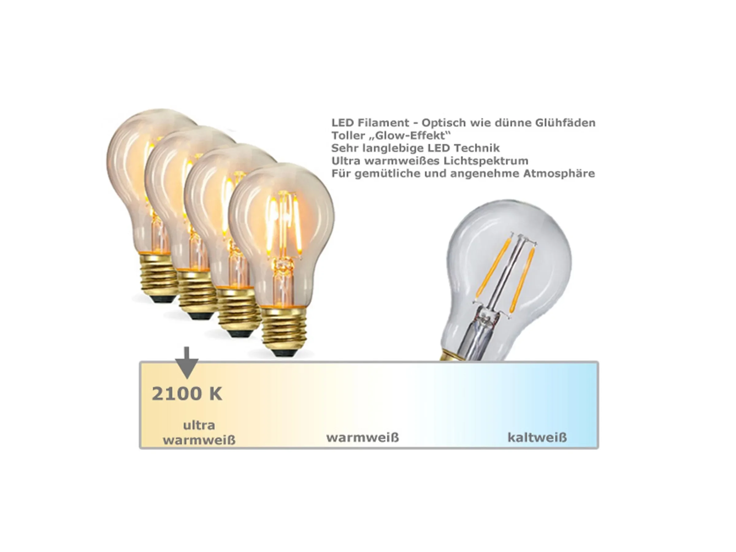 Highlights: Retro-Filamentoptik mit ultra-warmweißem Licht (2100 K), besonders gemütlich dank Edison-Design, wetterfest und langlebig, energiesparende 1,6-W-Lampen, ideal für stimmungsvolle Außenbereiche und festliche Anlässe.