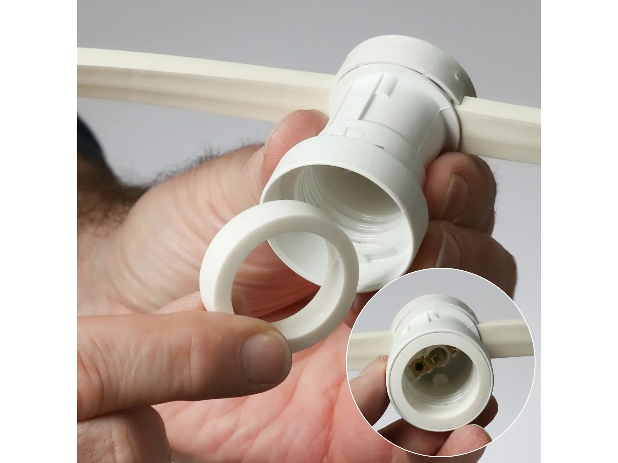 Die E27-Fassungen sind mit Gummidichtungen versehen und bieten zuverlässige IP44-Wetterfestigkeit. Die LED-G45-Kugellampen (1 W) erzeugen ein warmes Licht ähnlich Kerzenschein und sind dabei äußerst stromsparend. Perfekt für eine gemütliche und dauerhafte Außeninstallation.