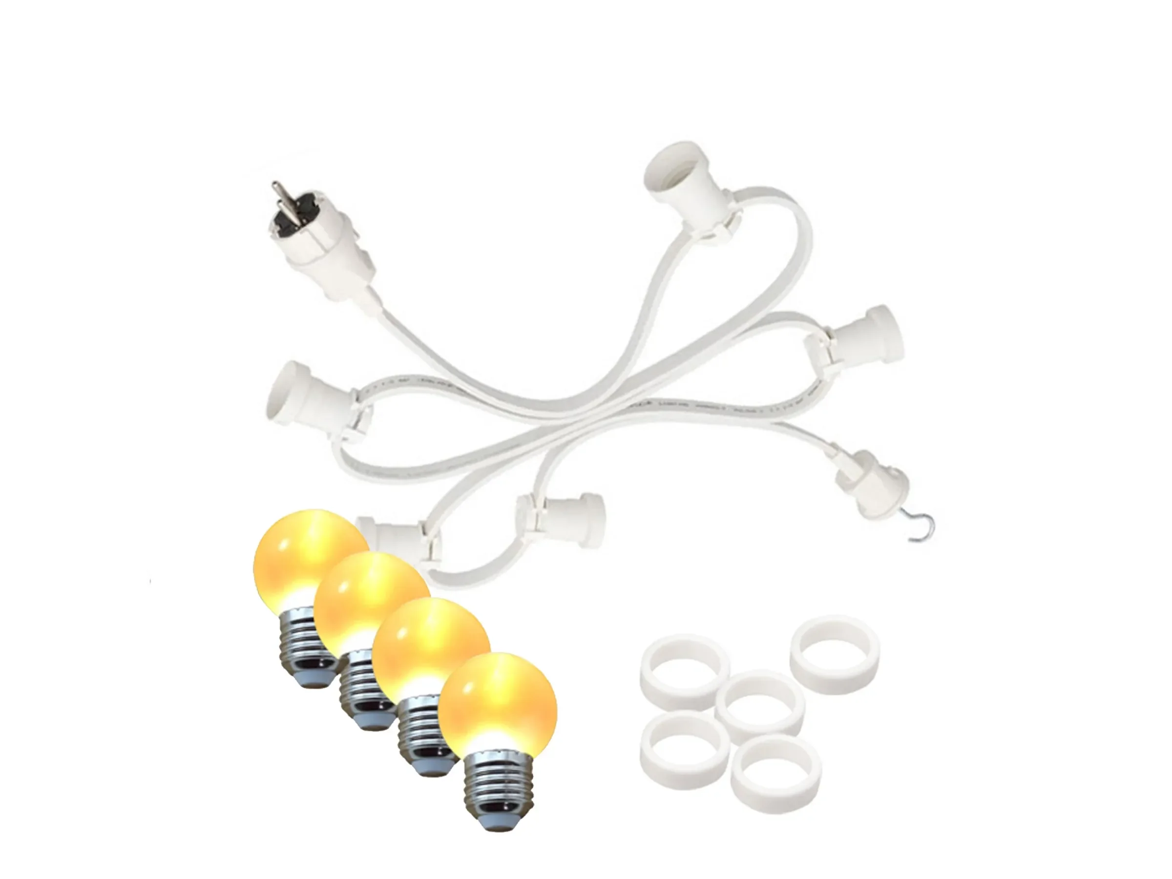 1 × 20 m Partylichterkette (Weiß) 40 × ultra-warmweiße LED G45 Kugellampen (1 W) Vormontierte Fassungen, Stecker & Endstück Bedienhinweise |