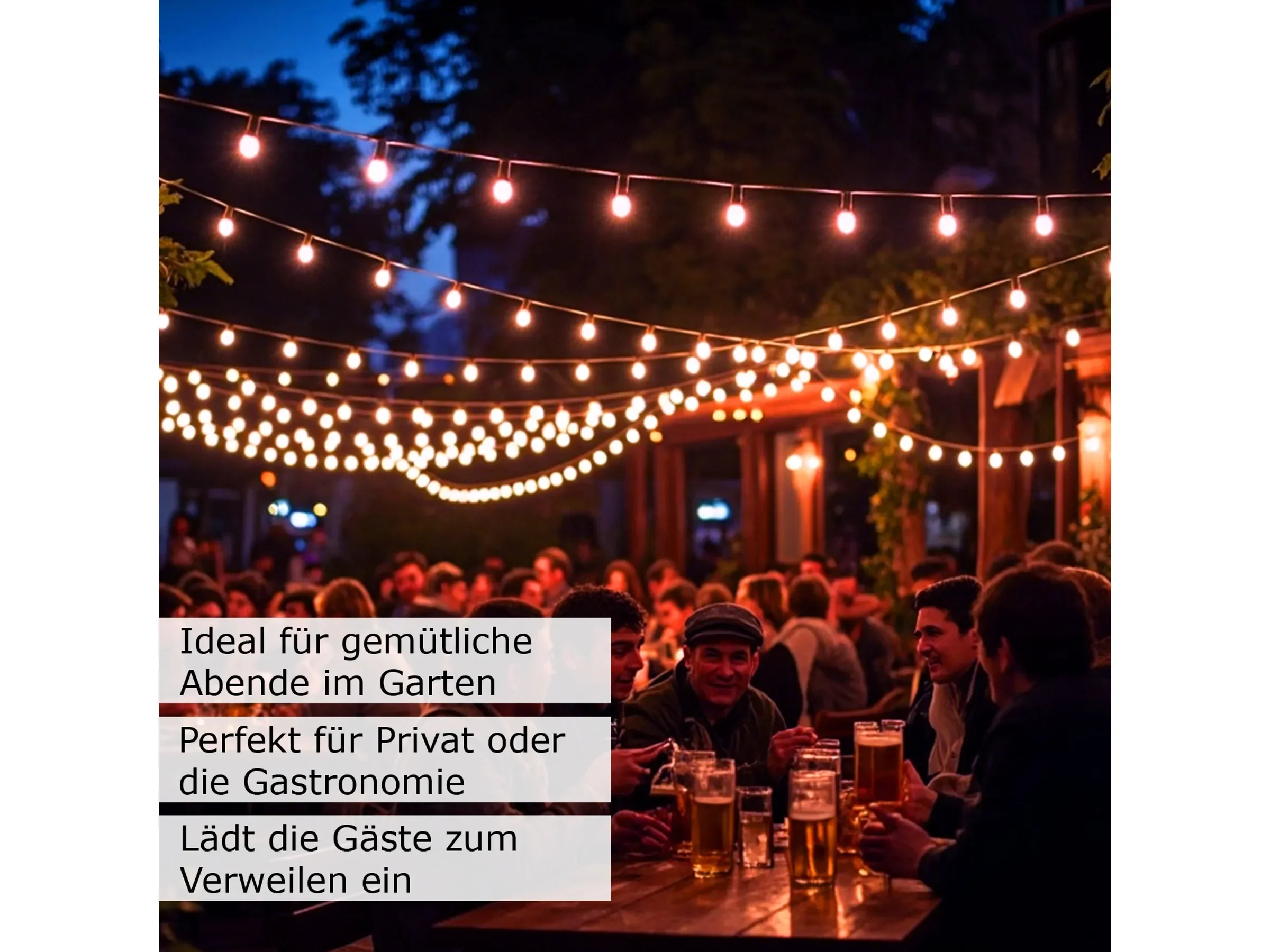 Diese hochwertige 20 m lange ILLU-Lichterkette mit 40 ultra-warmweißen LED Kugellampen bietet ein angenehm weiches Licht im klassischen Biergartenstil. Dank der robusten Bauweise, deutscher Fertigungsqualität und wetterfesten Komponenten eignet sie sich ideal für Garten, Terrasse, Balkon oder Veranstaltungen im Außen- und Innenbereich.