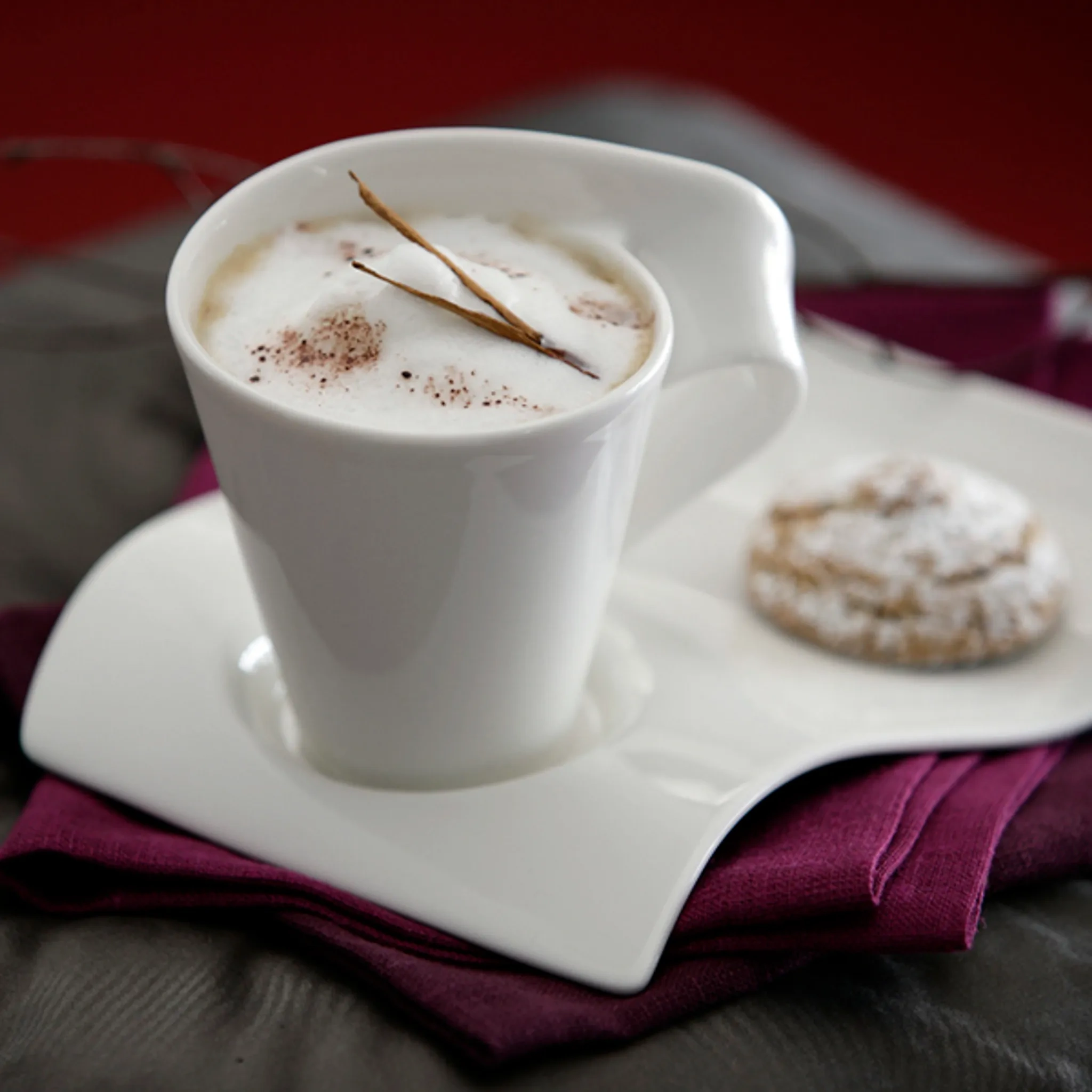 Highlights: Zeitlos elegantes Design mit markantem Wellenschwung, großzügige Unterteller für Gebäck oder Löffel, hochwertige Verarbeitung aus Premium Porzellan, mikrowellen- und spülmaschinengeeignet – ideal für den modernen Frühstückstisch.